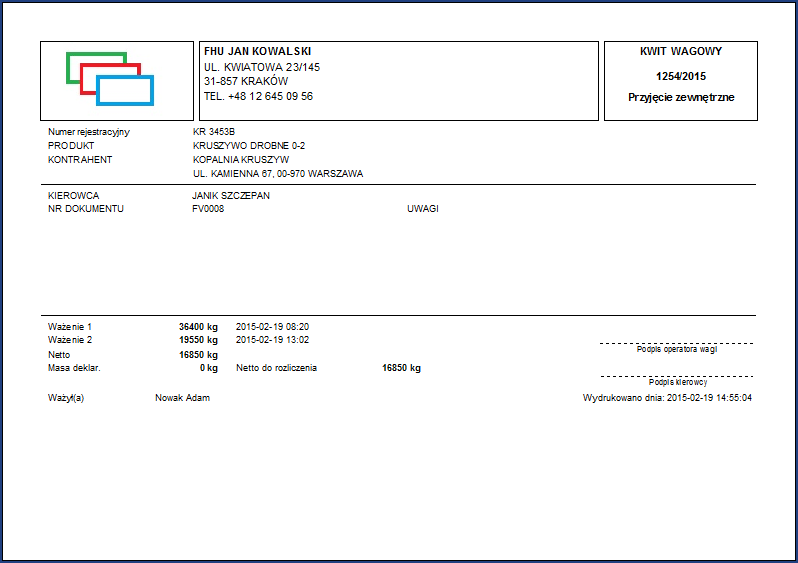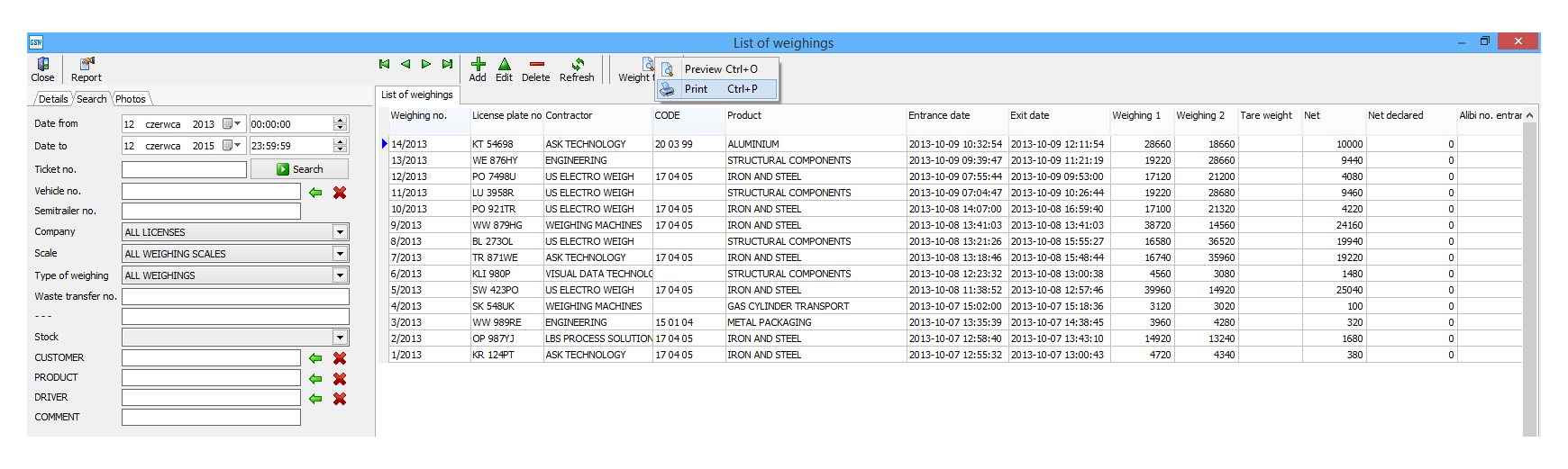 从对等重量清单和首次称重操作的窗口,有可能查看和打印一个称量票。称量票以如下格式输出:PDF, Ms Excel 和JPEG