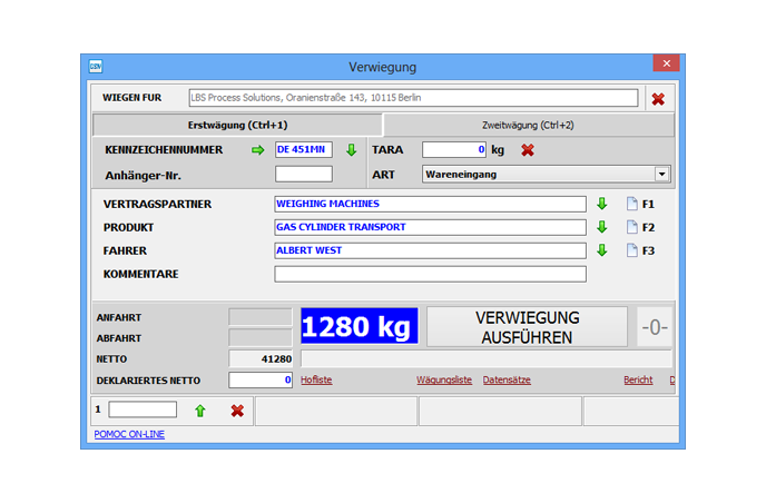ERST- UND ZWEITWÄGUNG Das Nettogewicht wird aufgrund der Differenz von zwei Wägungen abgerechnet: Einfahrts- und Ausfahrtswägung. Die Erst- und Zweitwägung wird oft als Einfahrt/ Ausfahrt bezeichnet. |