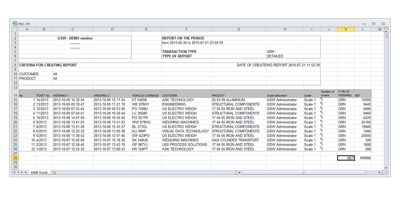 Reports are regarded as one of the software advantages. The GSW software contains a report generator that allows to create any summaries of performed weighing operations. In three simple steps a user can define report conditions and scope of data displayed on a print-out. Results are presented in a detailed (a list of all weighing operations) or summary form.