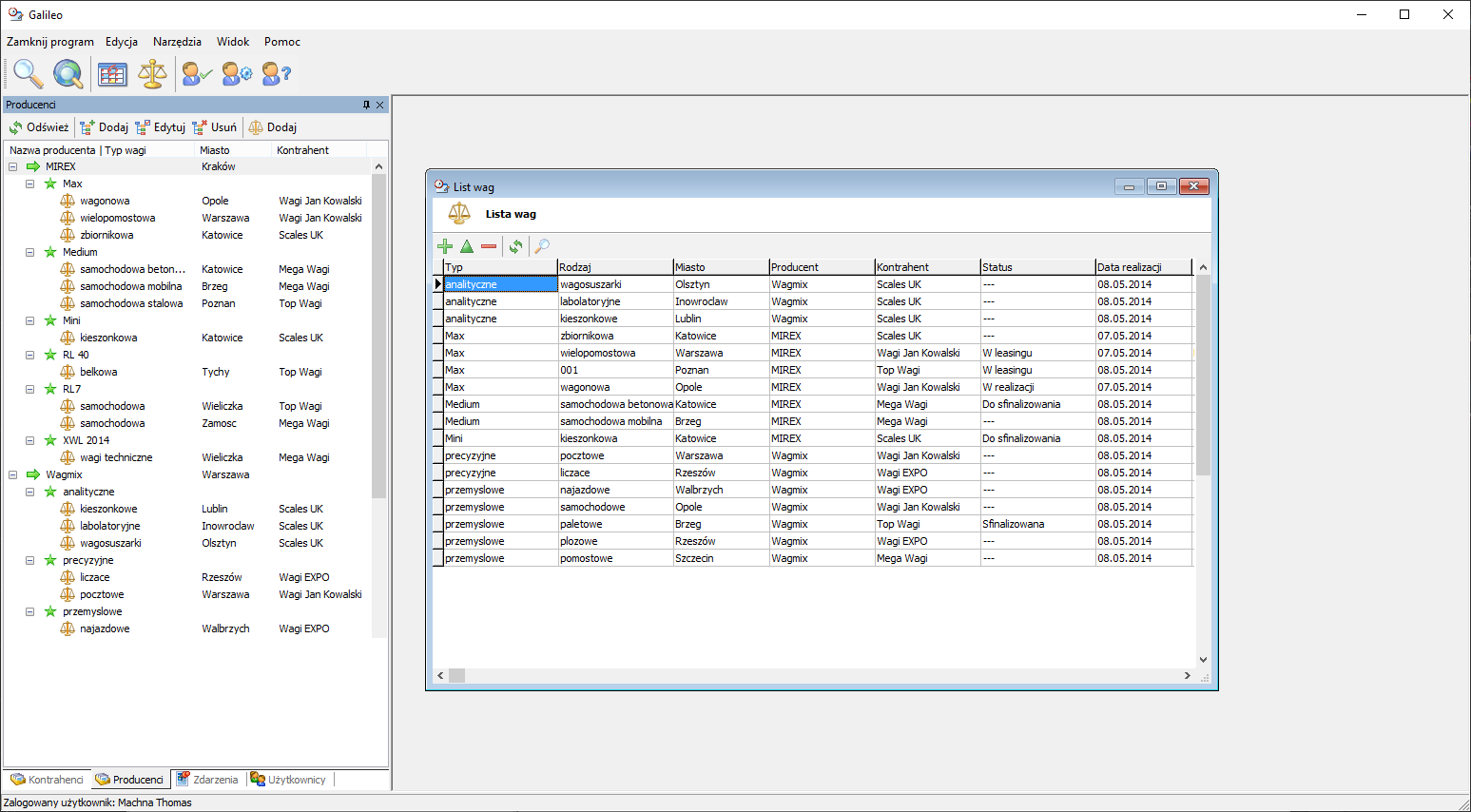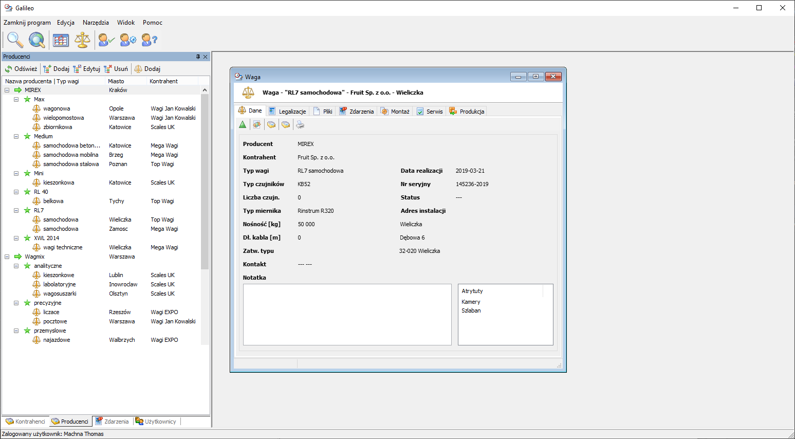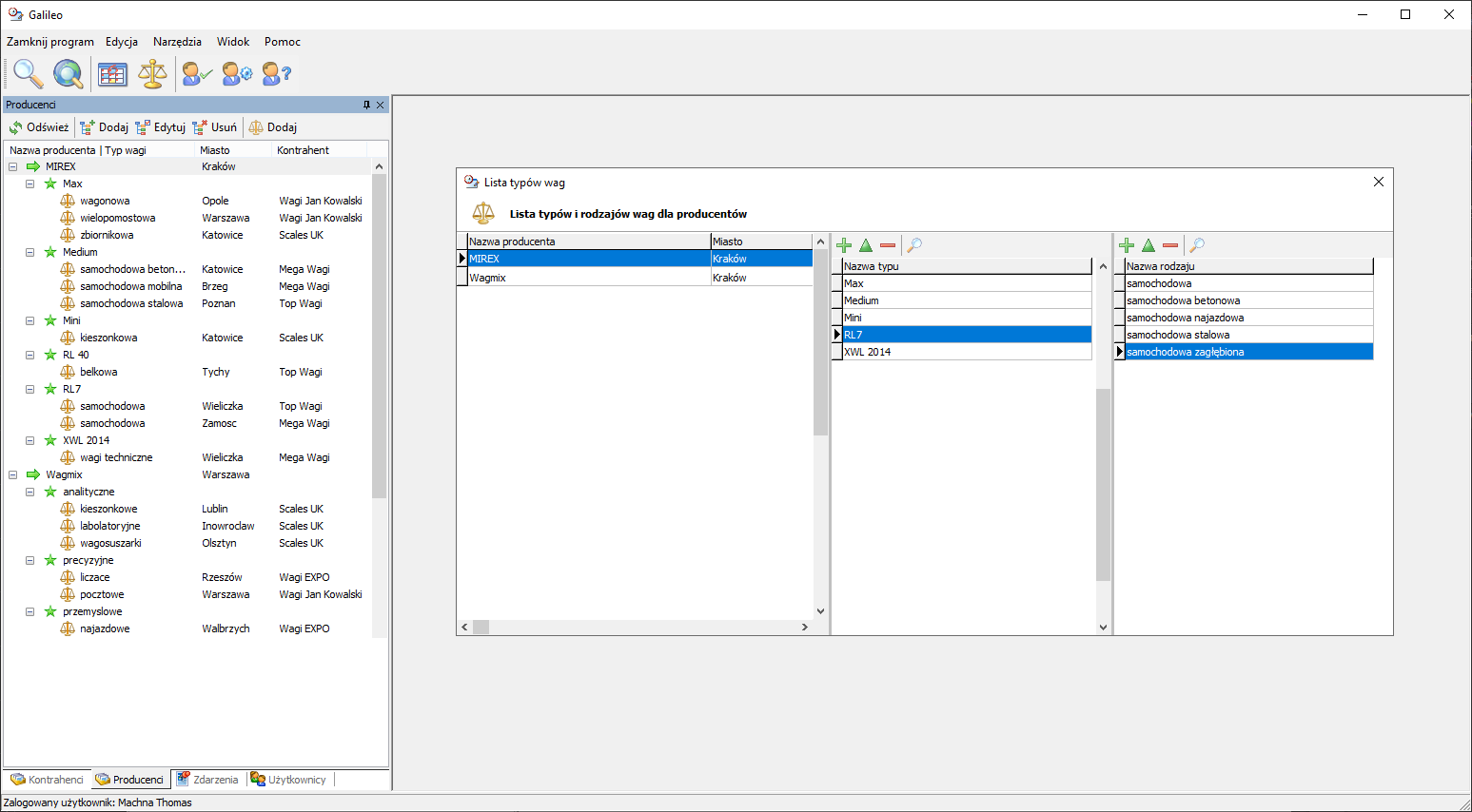 Galileo pozwala na tworzenie bazy zawierającej informacje o producentach wag. Do każdego producenta można dodać dowolną liczbę typów i rodzajów wag (np. paletowe, samochodowe itp). Takie rozgraniczenie umożliwia szybkie wyszukanie np. konkretnej ilości sprzedanych wag w danym przedziale czasowym lub w określonym regionie (np. w Małopolsce).
