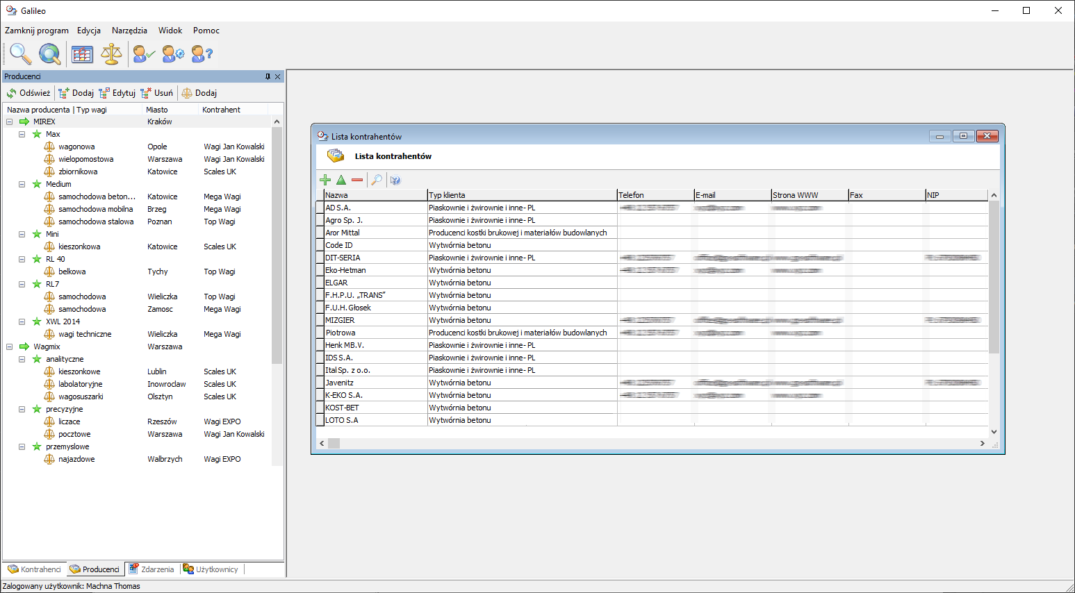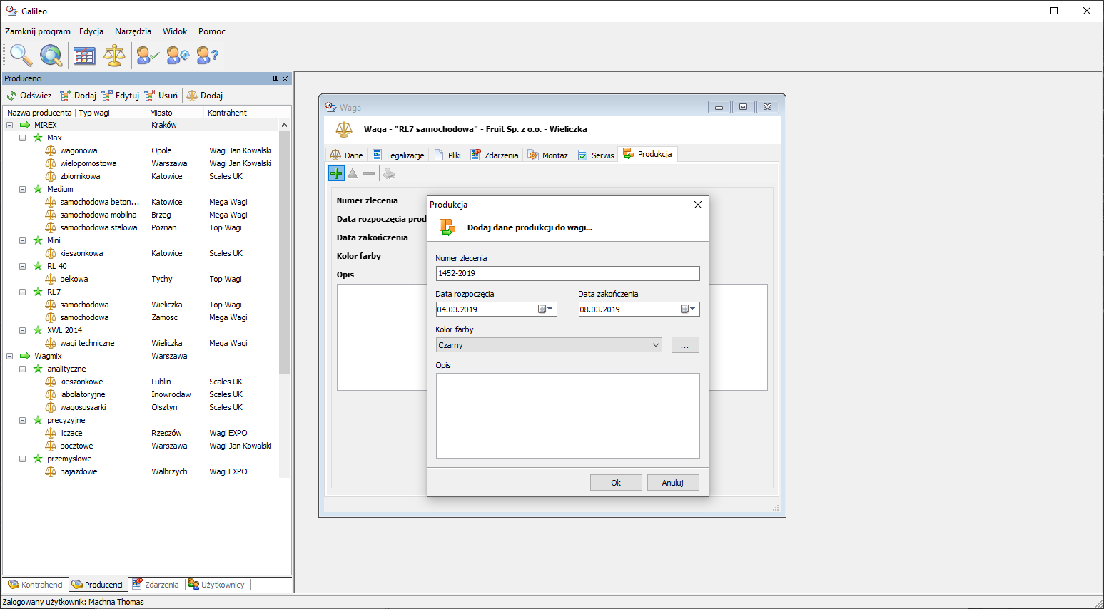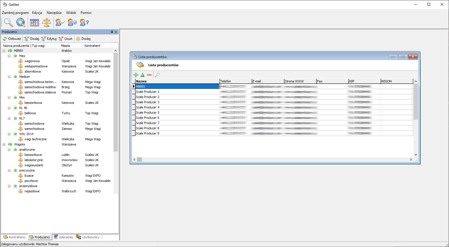 Galileo pozwala na tworzenie bazy zawierającej informacje o producentach wag. Do każdego producenta można dodać dowolną liczbę typów i rodzajów wag (np. paletowe, samochodowe itp). Takie rozgraniczenie umożliwia szybkie wyszukanie np. konkretnej ilości sprzedanych wag w danym przedziale czasowym lub w określonym regionie (np. w Małopolsce).
