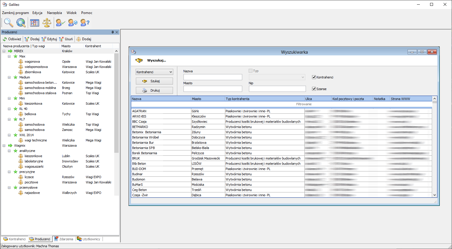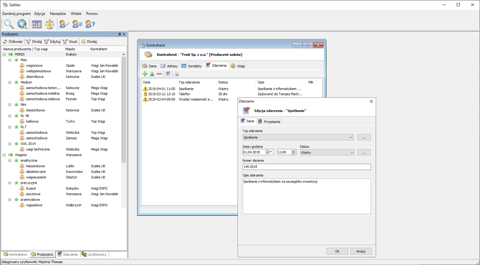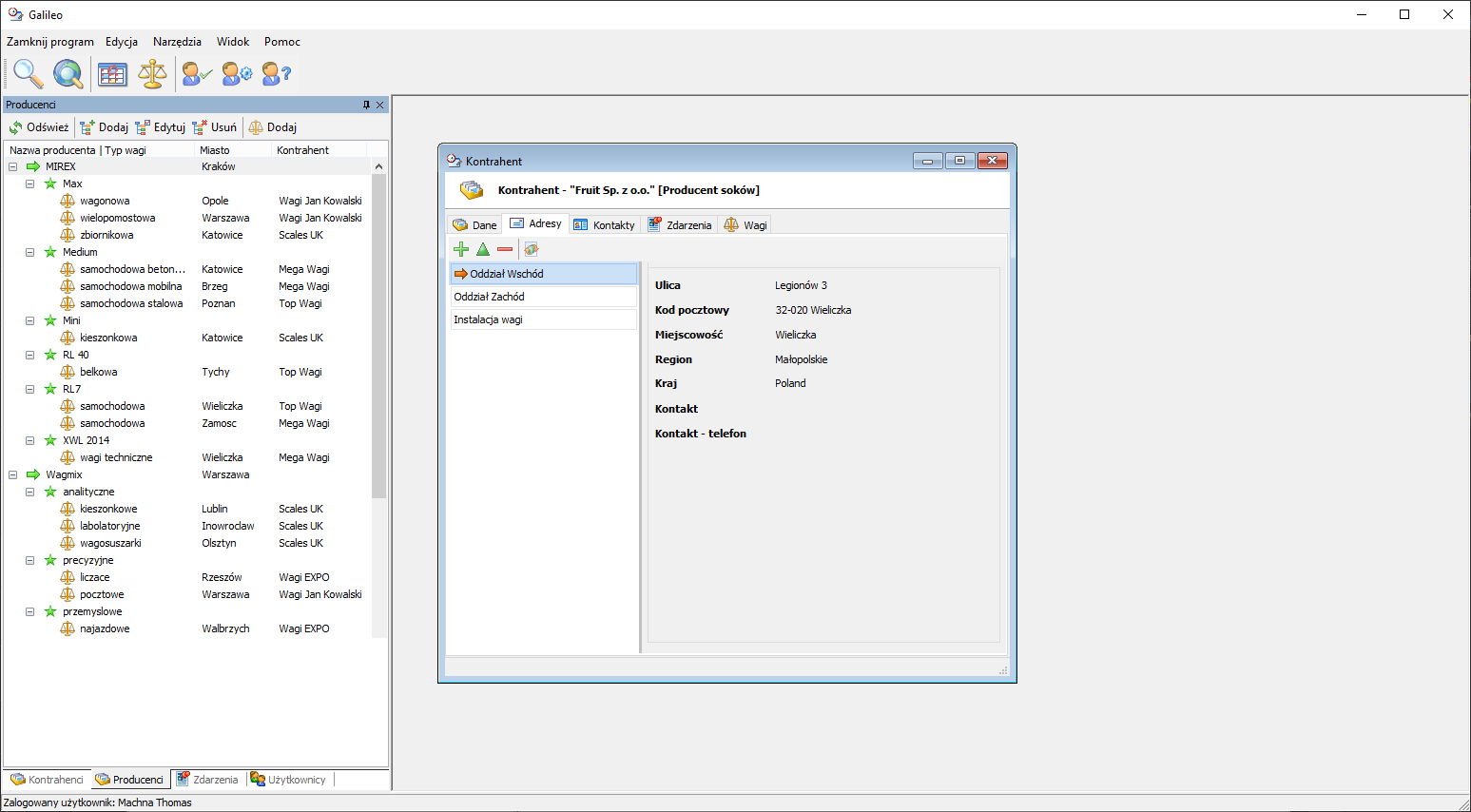 Do producenta wagi można również przypisać te same informacje, co do standardowego kontrahenta (adresy, kontakty, itp.).