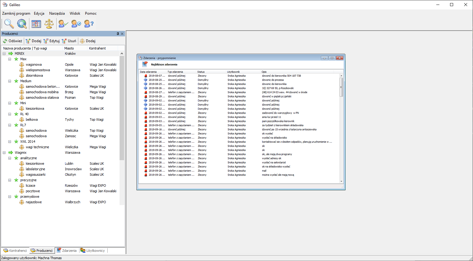Mechanizm obsługi bieżących zdarzeń dotyczy kontrahentów, producentów i wag. Zdarzenie może mieć dowolny typ oraz dowolny status. Typ zdarzenia określa jego przeznaczenie - np. "spotkanie". Natomiast status informuje o tym czy dane zdarzenie ma być przypominane i jeśli tak to komu i z jakim wyprzedzeniem. Dzięki mechanizmowi zdarzeń można prześledzić np. całą historię kontaktów z danym kontrahentem.