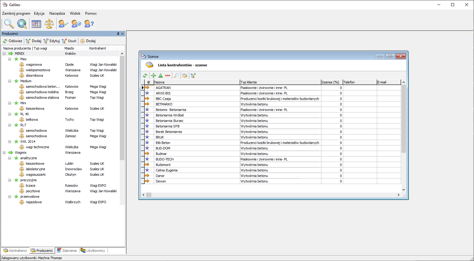 Potencjalni kontrahenci występują w programie pod nazwą "szanse". "Szanse" - to nowe, rokujące przedsiębiorstwa, które są zainteresowane kupnem wagi. "Szanse" posiadają większość funkcji kontrahentów poza opcją przypisywania wag.