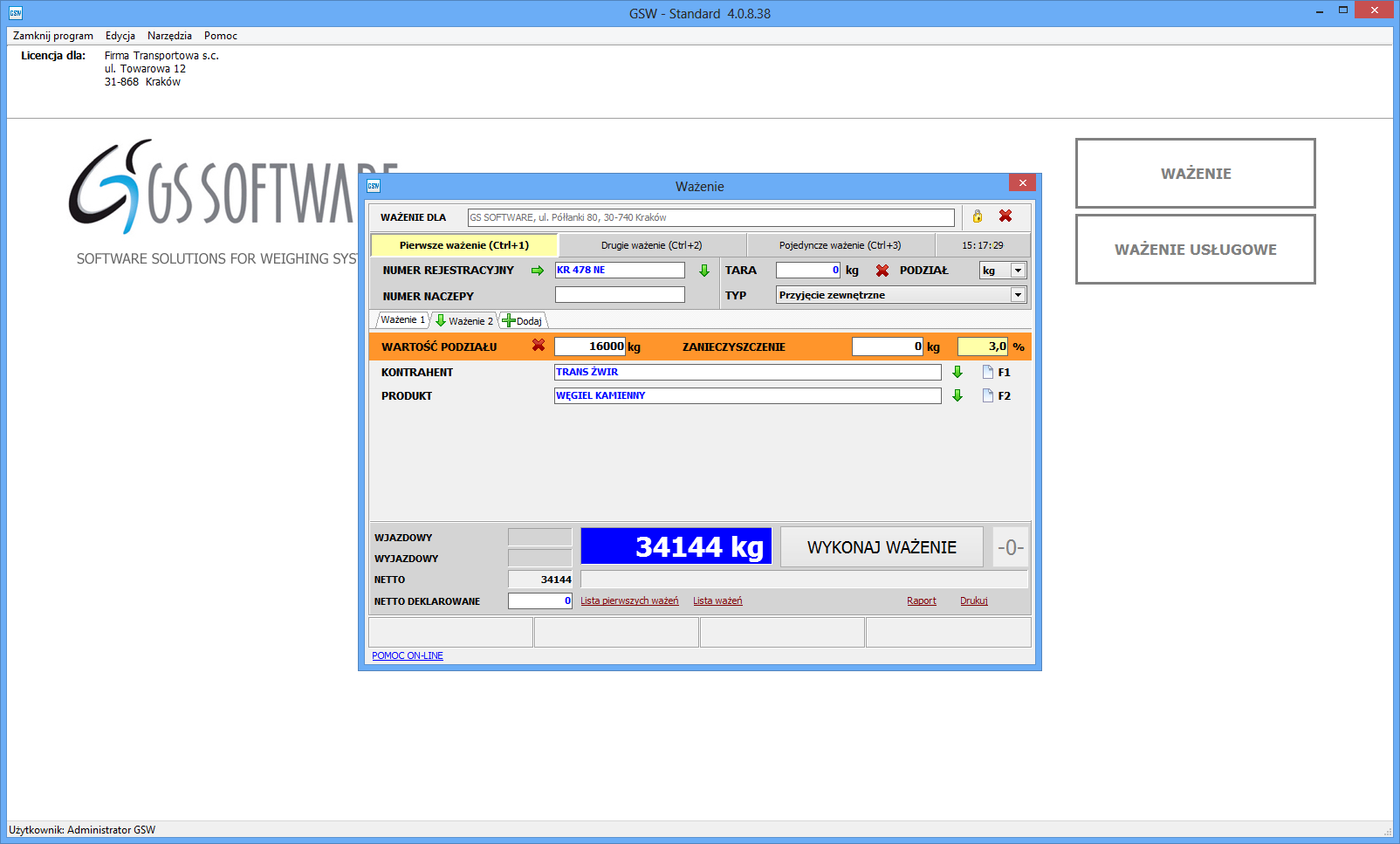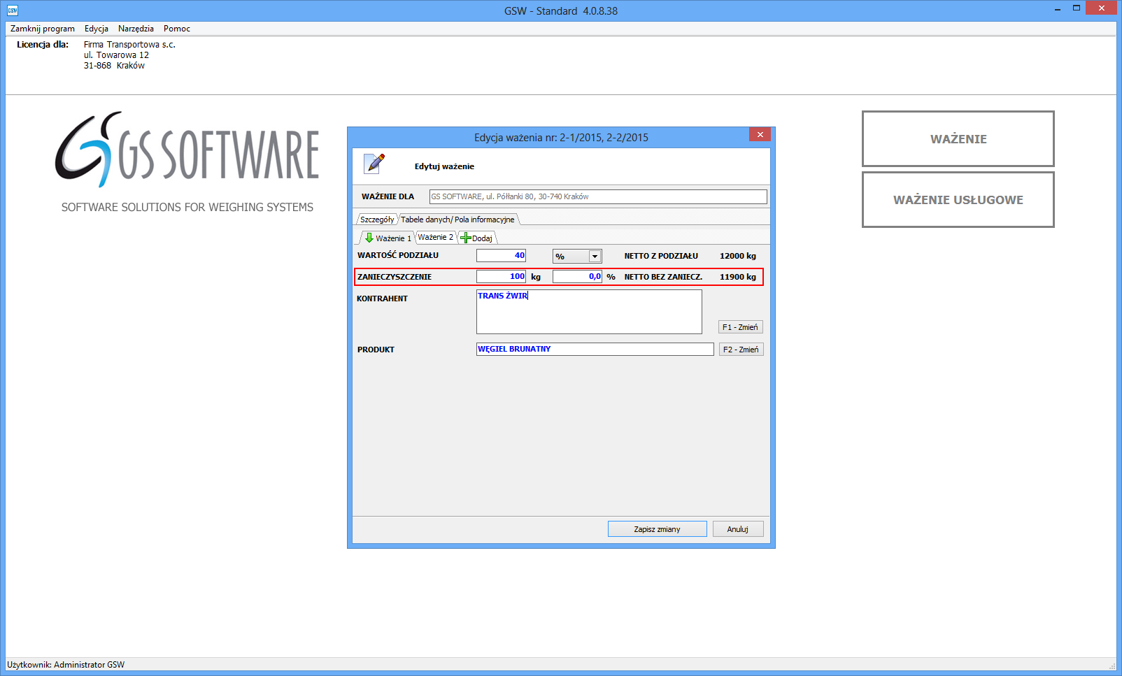 W oknie ważenia użytkownik określa czy zanieczyszczenie ma być wyrażone w procentach czy kilogramach oraz jaka jest jego wartość. Następnie program sam oblicza ile wynosi wartość ważenia pomniejszona o wartość zanieczyszczenia.