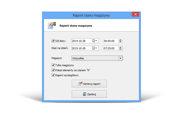 W module obsługi magazynu istnieje też możliwość stworzenia raportów ze stanów magazynowych. Raporty mogą dotyczyć wszystkich magazynów lub tylko wybranego. Użytkownik może określić szczegółowe parametry, które mają być widoczne na raporcie.
