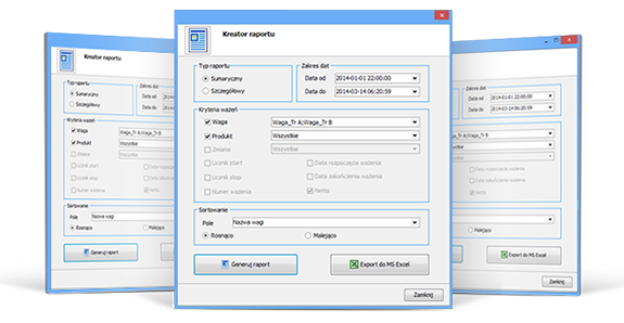 Program posiada kreator raportów, za pomocą którego możliwe jest przygotowanie raportów sumarycznych i szczegółowych z podziałem na wagi, zmiany, produkty. Wyniki raportu mogą zostać eksportowane do pliku w formacie Pdf lub MS Excel.